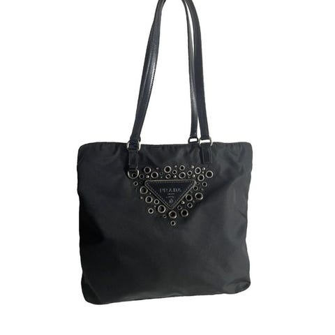 Aito Pradan musta nailoninen kangaskassi. Kuvassa oleva käsilaukku on Pradan mini Boston -laukku (tunnetaan myös keilailulaukkuna tai matkalaukkuna), joka on tyypillisesti valmistettu heidän tavaramerkiksi muodostuneesta nailonmateriaalistaan (usein nimeltään Tessuto tai Vela). Tässä klassisessa mustassa laukussa on ikoninen emaloitu metallinen kolmiologo etupuolella.