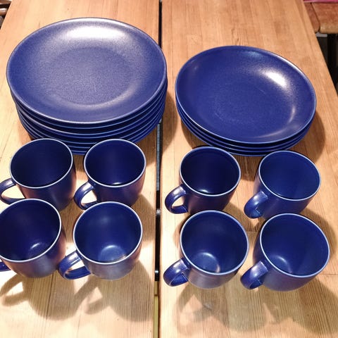 Arabian 24h sarjaa astiasto. Väri sininen. Neljä pientä lautasta, neljä isoa lautasta ja neljä mukia. Kaikki siistissä käyttökelpoisessa kunnossa. Joitakin pieniä vikoja voi esiintyä, mutta yleisilme siisti!