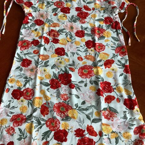 H&M naisten kesämekko, koko 38. Materiaali 100 % viskoosia. Mekossa on kirjava, kukkakuvioinen kuosi vaalealla pohjalla. Hihat ovat puolipitkät ja niissä on solmittavat aukot olkapäillä.