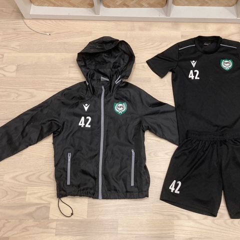 Craft ja Clique jalkapalloasut juniorille. Koko Craft-puvussa merkintä 146/152 ja Clique-paidassa 150/160. Väri pääosin musta, seuran NoPS-logo ja numeromerkinnät keltaisella. Settiin kuuluu pitkähihainen vetoketjullinen Craft-pelipaita, Craft-shortsit sekä lyhythihainen Clique-pelipaita. Materiaali teknistä, urheiluun sopivaa polyesteriä. Soveltuu jalkapalloharjoituksiin ja -peleihin junioripelaajalle.