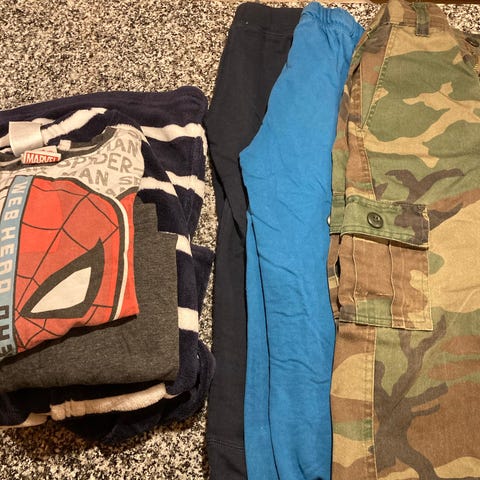 Hämähäkkimies vaatepaketti yhdessä. Koko merkinnät vaatteissa vaihtelee huomattavasti, mutta käytetty koossa 110/116.