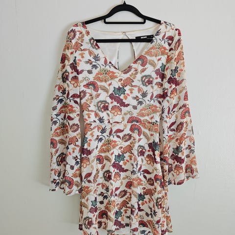Bik Bok kukkakuvioinen kesämekko kokoa S. Lyhythihainen, polvipituinen malli. Pyöreä pääntie ja kevyesti laskeutuva helma. Säilytyksessä rypistynyt.