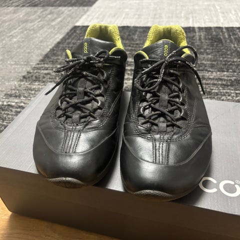 Ecco tennarit, koko 45. Mustat nauhalliset vapaa-ajan kengät, päällinen nahkaa ja osittain rei’itetty parempaa hengittävyyttä varten. Vaalea ulkopohja, matala varsi. Sopivat arkikäyttöön ja kevyeen ulkoiluun.