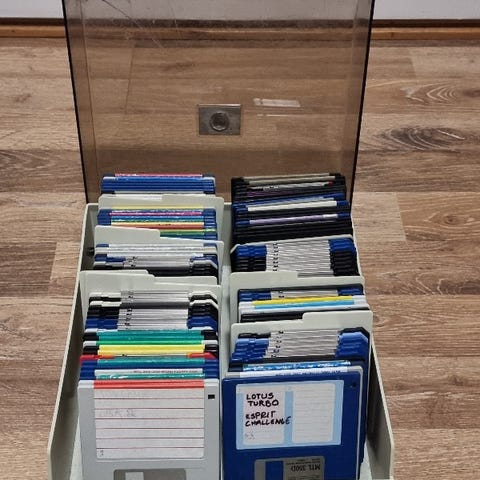 Amigan 3,5” korppuja / diskettejä / levykkeitä sekä ajan hengen mukainen diskettiboxi. Levykkeitä en pääse testaamaan, koska minulla ei ole enää Amigaa. Olettaisin että suurin osa on kunnossa. Levykkeitä on yhteensä vähän reilut 100 kappaletta.