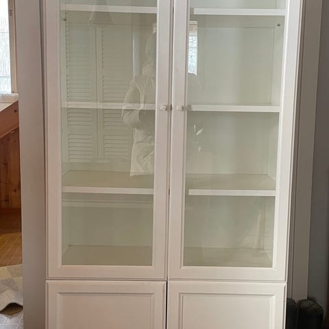 Tarpeettomana siisti vitriinikaappi tummalla puukuosilla.