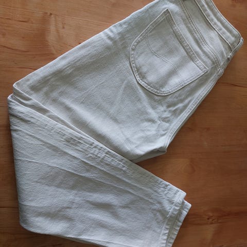 Valkoiset, siistit mom jeans-tyyppiset klassikkofarkut. Laadukkaan Lee’n Carol-malli, jossa suora, aavistuksen alas kapeneva lahje ja korkea vyötärö. Lahkeenpituus 35, vastaa mielestäni n. pituutta 33 (olen 170 cm). Lahkeen sisämitta 74 cm.