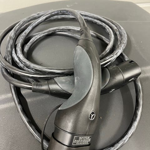 Alkuperäinen Mercedes-Benz latauskaapeli ja ohjainlaite. Mukana ohjainboksi, jossa merkkivalot (power, charging, temperature, fault) sekä kiinteä kaapeli auton latausliittimeen.