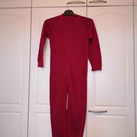 Kirsikanpunainen merinovillahaalari, ostettu Prismasta. Edestä pääntien läheltä korjattu pari reikää merinovillapaikoilla, samoin takaa haaruksista. Hieman nyppyinen, mutta käyttökelpoinen ja toimiva.