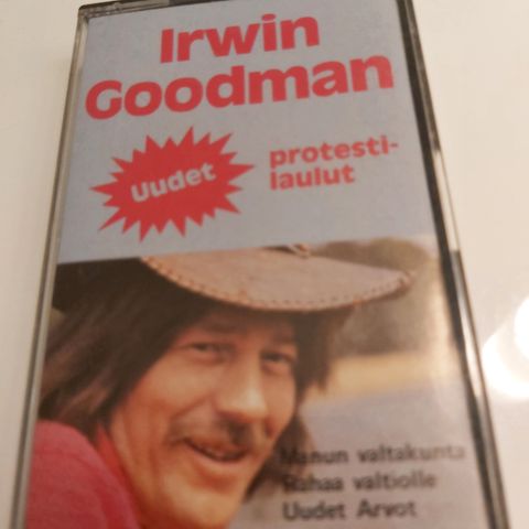 Irwin Goodman Uudet protestilaulut C-kasetti. Äänite sisältää Irwin Goodmanin protestilauluja, mukana mm. kappaleet "Maan vihatessa", "Olen väsynyt", "Rahan valta", "Uudet arvot" ja muita levyn kappaleita. Kotelo ja kasetti mukana, kasetin etiketissä ja kannessa kappalelistaus.