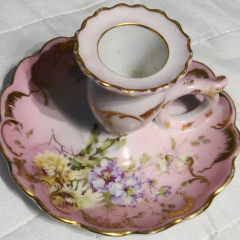 Lautanen on aikoinaan 1920 -luvulla hankittu Itävallasta. Se on joskus mennyt rikki ja osat on liimattu jossain vaiheessa yhteen. Päällepäin liimausta ei juurikaan erota, ainoastaan pikku pala pintaa on pois. Se näkyy toisessa kuvassa valkoisena, pienenä pisteenä kuvan alaosassa. Pohjasta katsottaessa liimasaumat erottaa paremmin. Halkaisija on noin 13,4cm ja leveys noin 8,3cm. Korkeus on noin 2cm. Pohjassa on numero 1524/6. Tämän sarjan kynttilänjalka on minulla myös myynnissä täällä.