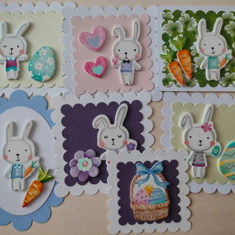 Leikattavia kartonkikuvioita korttiaskarteluun. Suurimmat arkit 16x30 cm. Osa kaksipuoleisia.