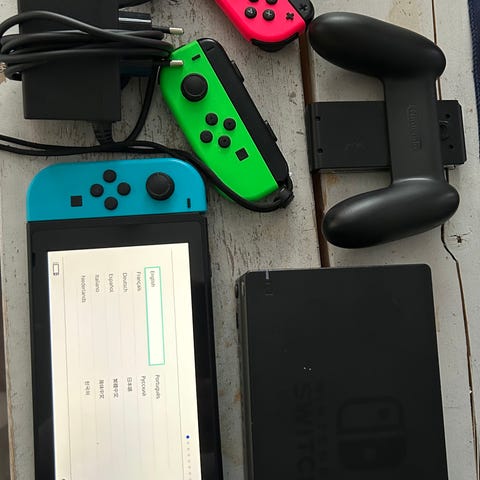 Nintendo Switch pelikonsoli neon punaisilla ja sinisillä Joy-Con -ohjaimilla. Mukana telakka televisiokäyttöä varten, Joy-Con -ohjainpidike, rannekkeet, virtalähde ja käyttöohje. Konsolia voi käyttää sekä käsikonsolina että telakan kautta televisioon liitettynä. Soveltuu useille eri pelityypeille ja monenlaisille pelaajille.