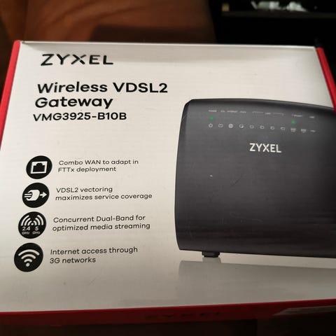 Zyxel ADSL -modeemi. Laitteessa on useita Ethernet-portteja ja se soveltuu ADSL-laajakaistayhteyden jakamiseen kiinteällä verkolla. Tarkemmat tekniset tiedot ja malli näkyvät pakkauksessa.