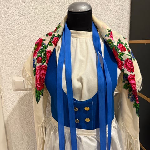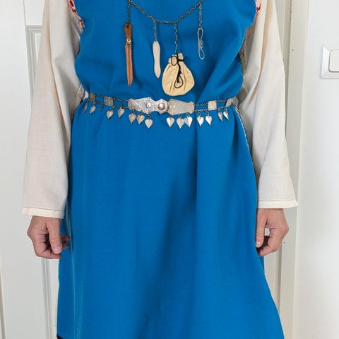 Aino-kansallispuku on valmistettu sinisestä villakankaasta, jota koristavat perinteiset punavalkoiset kuvioinnit helman ja yläosan reunoissa. Settiin kuuluu valkoinen paita, punainen päänauha sekä useita metallisia koruja ja näyttävä helavyö. Helavyössä on havaittavissa käytön jälkiä ja pieniä vaurioita.Kokonaisuus sisältää mekon, paidan, päänauhan, helavyön, solkia ja rintakoruja. Helavyössä on havaittavissa pieniä vikoja.Mekon olka - helma pituus n. 100 cmMekon kainalo - kainalo mitta n. 53 cmMekon materiaali: villaPaidan materiaali: pellavaVäri: sininen, valkoinen, punainen, hopea