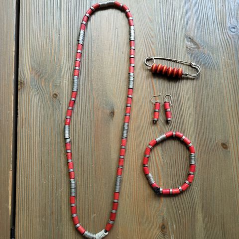 Aarikka puinen korusetti, johon kuuluu riipus ja korvakorut. Korut on valmistettu puisista osista kultaisilla metalliosilla. Rintaneulassa on ihmishahmoa muistuttava puufiguuri, korvakoruissa roikkuvat puuosat metalliketjuissa. Sopii käytettäväksi eri vuodenaikoina arki- ja juhlapukeutumisen yhteydessä.