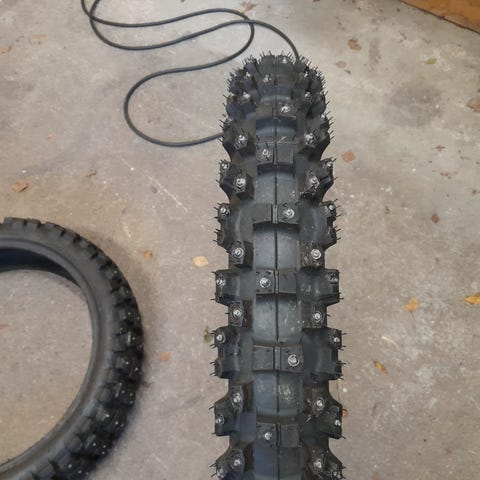 Eturengas 90/90-21, takarengas 130/90-17. Yli puolet pintaa jäljellä.