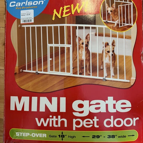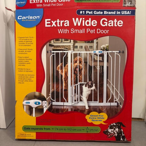 Carlson Extra Wide Gate on valkoinen metallinen lemmikkiportti, jossa on pieni lemmikkiovi. Portin leveys on säädettävissä noin 74–112 cm:n välille ja korkeus on noin 77 cm. Portti sopii esimerkiksi oviaukkoihin ja portaikkojen eteen koirien ja kissojen kulun rajaamiseen. Pieni lemmikkiovi mahdollistaa pienikokoisen lemmikin kulkemisen portin läpi ilman koko portin avaamista. Portti kiinnitetään paikoilleen painekiinnityksellä ilman pysyviä ruuvikiinnityksiä, ja siinä on lukittava sulkumekanismi aikuisten avattavaksi. Metallirakenne on suunniteltu sisäkäyttöön lemmikkien hallittuun erotteluun kodin eri tiloissa.