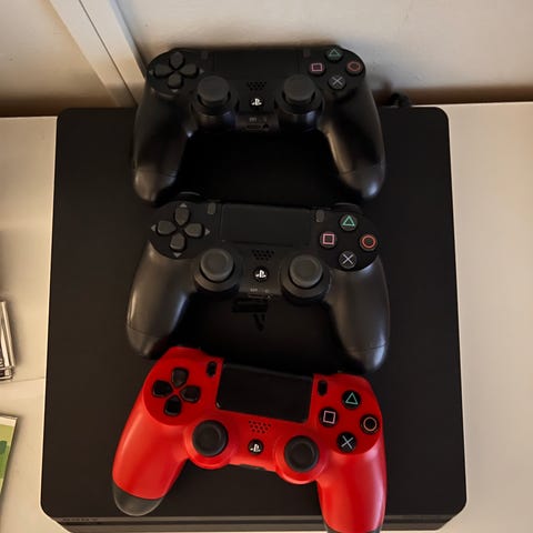 Playstation 4 pelikonsoli kahdella mustalla ja yhdellä punaisella ohjaimella