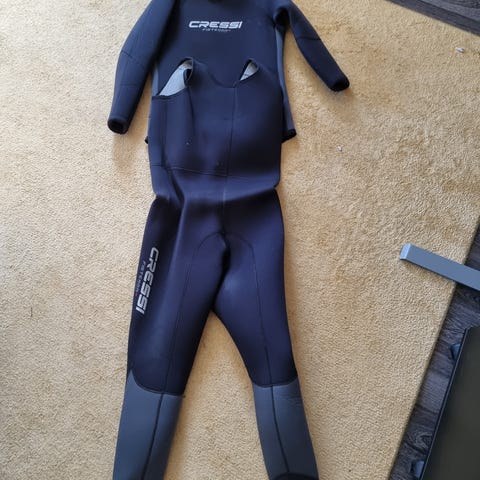Cressin S-koon 3mm paksu märkäpuku, naisten malli. Pientä nukkaantumista, muuten hyvässä kunnossa ja ehjä.