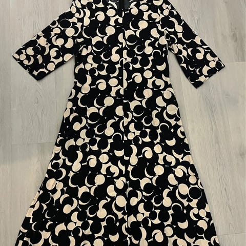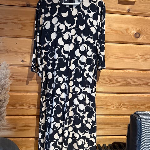 Marimekon kauniisti laskeutuva viskoosimekko. Kai-kai mitta noin 55 cm ja pituus 120 cm. Edessä vyötärön kohdalle pieni langannousu, joka näkyy kuvissa. Tämä huomioitu hinnassa.