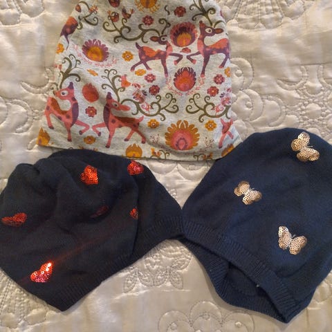 Kevät- / Kesä- / Syyspipot, kokomerkinnät one size. Sopivat päiväkoti-ikäiselle. Eivät pahemmin uudelle häpeä. En huomannut mitään huomioita kunnossa.