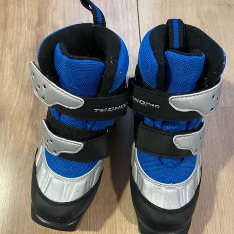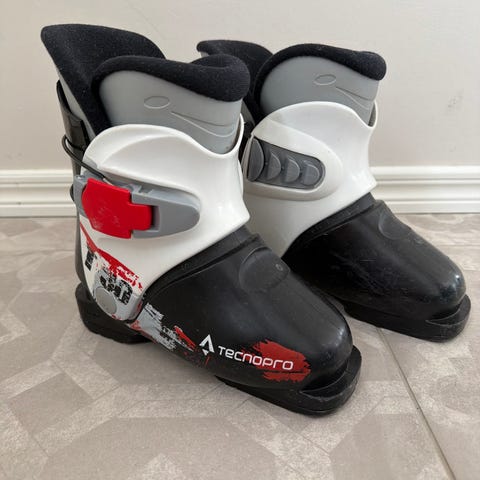 Tecnopro Snowcat lasten monot. Koko euro 27 (Mondo 17,5, USA 9, UK 8). Väri pääosin pinkki ja valkoinen, harmaalla sisävuorella ja kuvituksella ulkopinnassa. Monossa yksi solkikiristys ja takana kantahihna helpottamassa jalkaan laittoa ja kantamista. Soveltuu lapsille alppihiihtoon.