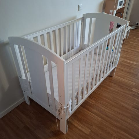 Kahdella lapsella käytössä ollut pinnasänky. Toinen laidoista on säädettävä, helppo nostaa ja laskea. Sälepohja säädettävissä kolmeen eri korkeuteen.