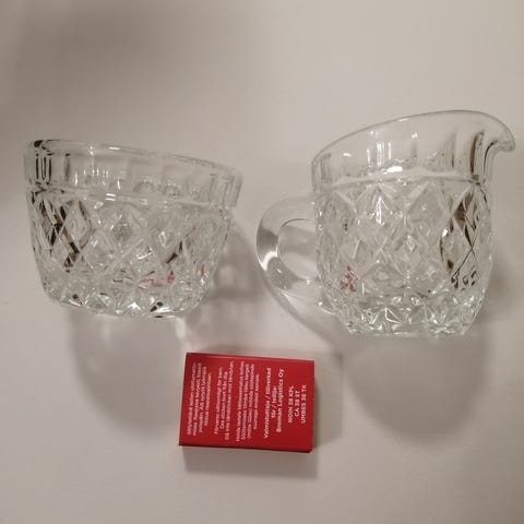Hakusanat: astiat, kaatimet, nekat, kermakot, kermanekat, kristalli, kristallikaatimet, sokerikot, sokeriastiat, kristallisokerikot, Riihimäki, Riihimäen lasi, retro, vintage, design, Finnish design. Lähetän.