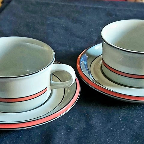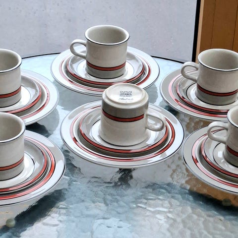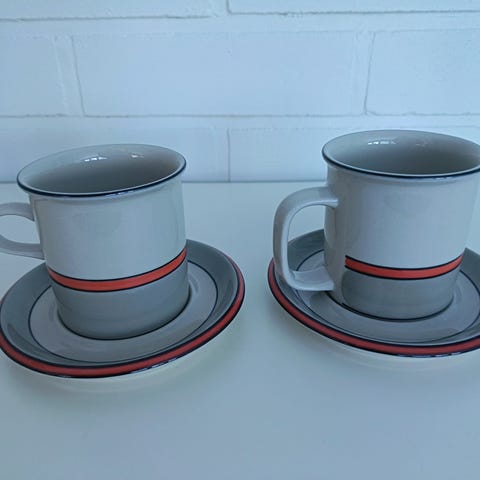 Arabia Aslak mukit 3 kpl, korkeus 9 cm ja halkaisija 8 cm. Suunnittelija Inkeri Leivo, tuotannossa 1990-1995.