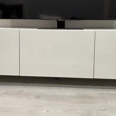 Hyvä kunnossa oleva Bestå-tv-taso. Pientä käytönjälkeä, pahin kolhu jää piiloon oven taakse (kuva).