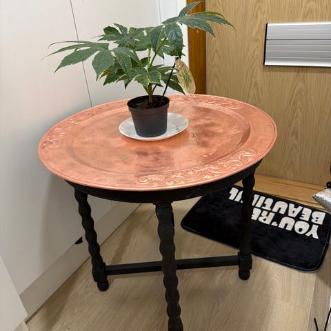 Pyöreä sivupöytä, jossa valkoinen marmorikansi ja koristeelliset, kaartuvat jalat. Pöydän alaosassa on rottinkipintainen hylly. Runko on maalattua puuta ja tyyliltään klassinen. Soveltuu esimerkiksi olohuoneen tai makuuhuoneen pieneksi pöydäksi tai kasvipöydäksi.