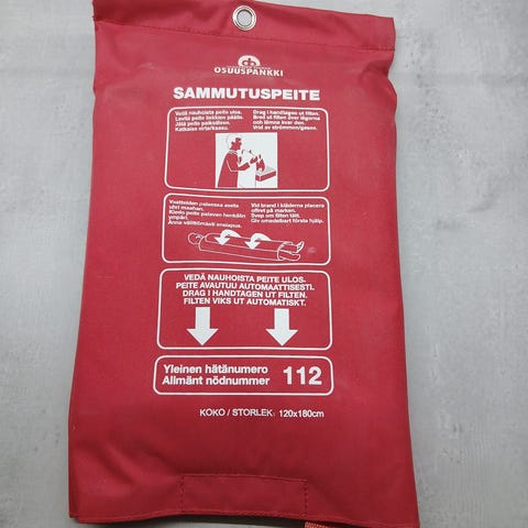 Sammutuspeite 100 x 120 cm, punainen. Tarkoitettu pienten tulipalojen tukahduttamiseen esimerkiksi kotona, keittiössä, autossa, asuntovaunussa, grillikatoksessa, työmaalla tai veneessä. Peite säilytetään punaisessa pussissa, josta se vedetään ulos alareunan hihnoista. Käyttöohjeet on merkitty pakkaukseen suomeksi ja ruotsiksi.