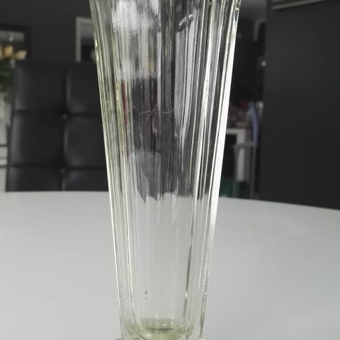 Vanha kirkas lasimaljakko. Korkeus n. 20,7 cm. Lasimassassa on muutama ilmakupla ja lasin ulkopinnalla on kuvassa 2 näkyvä viiru. Viiru tuntuu sormeen/kynteen, kun sitä kokeilee. Viiru ei kuitenkaan ole särö, vaan valmistuksessa tullut valuvika tms.
