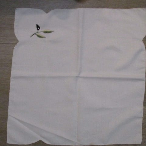 Vaaleanpunainen, pienehkö pöytäliina. Materiaali lienee pellavaa tai puolipellavaa. Koko n. 46 x 46 cm.