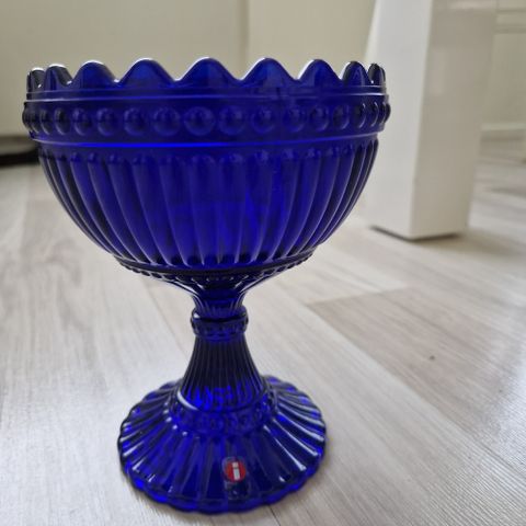 Malja on jalallinen ja koristeellisesti muotoiltu, sopii esimerkiksi tarjoiluun tai sisustusesineeksi.