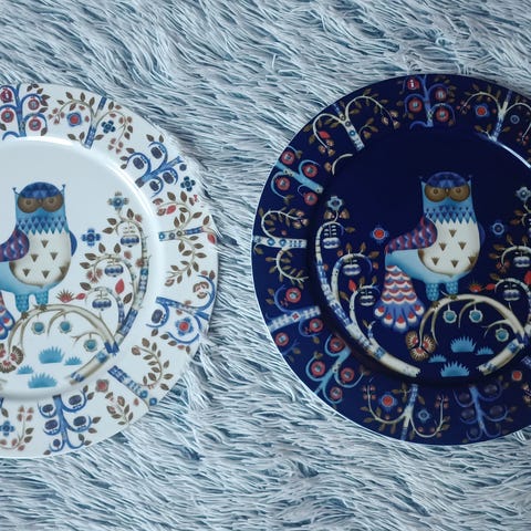 Iittalan Taika lautasia, halkaisija 27cm. Vähällä käytöllä olleita, kunnon auringonvalossa näkyy punaisessa ja sinisessä lautasessa pieniä naarmuja kun tarkkaan katsoo.
