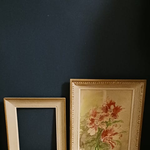 Taulu kukka-aiheella. Koristeellinen kultasävyinen vanha puinen kehys 50 x 40 cm.