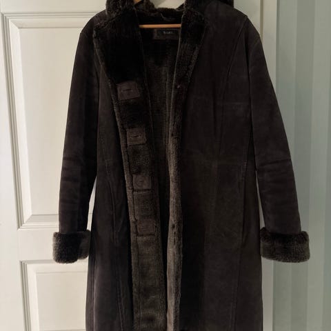 Päällinen nahka, vuori. Takin pituus n. 106 cm, vyötärö n. 104 cm, hiha pituus 64 ja hihansuu sisämitta n. 30.