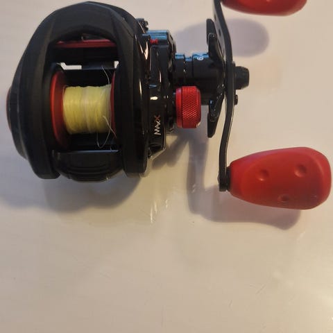 Abu Garcia Ambassadeur -hyrräkelavapa punaisella vavalla ja korkkikahvalla. Settiin kuuluu hyrräkela, jossa on kaksoiskahva.