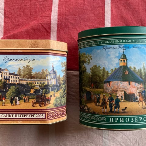 Vintage, georgialainen tee metallirasia, jossa venäjänkielinen teksti kannessa ja maisemakuvat sivuilla. Rasia on suorakulmainen ja valmistettu metallista. Sopii esimerkiksi säilytysastiaksi keittiöön tai koriste-esineeksi. Rasiassa on saranoitu kansi, jonka sisäpuolella on lisätekstiä venäjäksi. Hyvässä kunnossa oleva teepurkki. Korkeus 14 cm x 10 cm ja 7 cm. Hinta 9 euroa. Voin lähettää. Mmm.