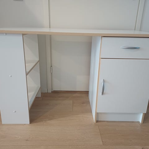 Kapea kirjoituspöytä, laatikostot molemmin puolin. Lähes virheetön kunto. Syvyys 46 cm, leveys 125 cm.