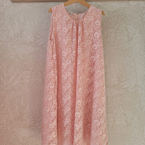 Vaaleanpunainen vuorellinen pitsimekko kokoa 146. Käytetty vain parissa juhlissa siististi, joten kunto uudenveroinen.