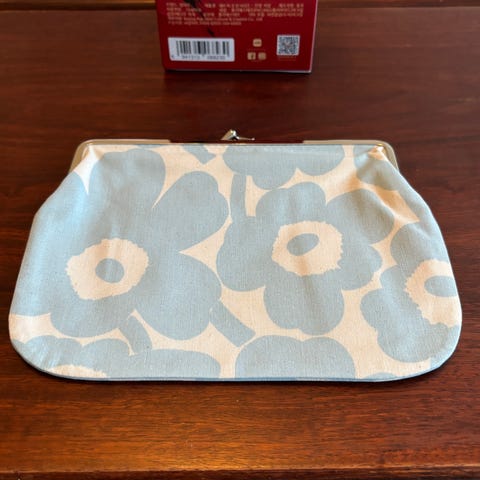 Marimekko Mini Unikko Puolikas kukkaro on valmistettu puuvillakankaasta, joka on painettu Helsingissä. Tilavassa kukkarossa on metallinen kehys, joka on helppo napsauttaa auki ja kiinni.