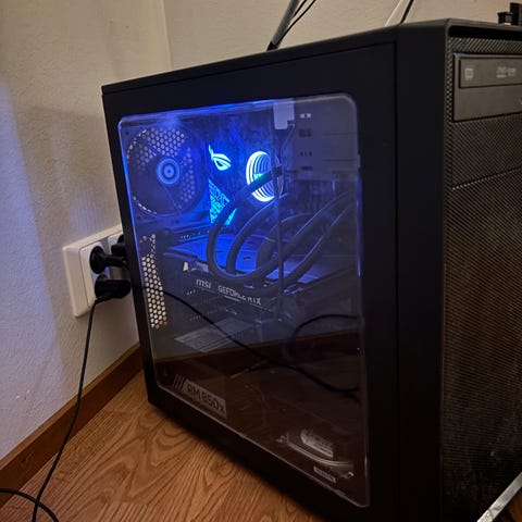 Asus ROG pelipöytäkone. Kotelossa on etupaneelissa RGB-valaistu valonauha ja yläosassa kantokahva helpottamaan siirtelyä. Sivupaneelissa on ilmanvaihtoaukot jäähdytystä varten. Tietokoneessa on integroidut verkkoyhteydet (LAN ja mahdollisesti langaton yhteys. Speksit näkyvät kuvissa. Pyörittää Cs:ssää noin 200fps