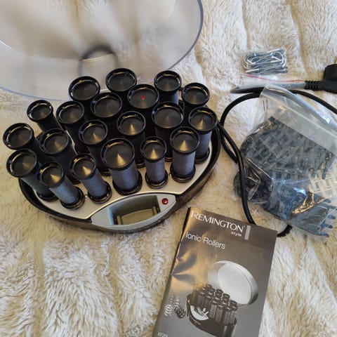 Remington lämpörullat. Kokeiltu vain kerran. Laitteessa on kannellinen lämpöalusta ja useita erikokoisia lämpörullia. Mukana tulee pidikkeitä rullien kiinnittämiseen sekä käyttöohje. Sopii hiusten kihartamiseen ja muotoiluun kotikäytössä.