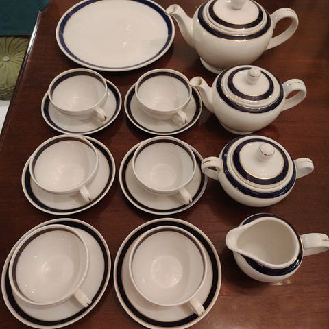 Astiasto sisältää tarjoilulautasen, jonka halkaisija n. 33 cm, asetit n. 15cm ja teekupit n. 10cm halkaisijaltaan.