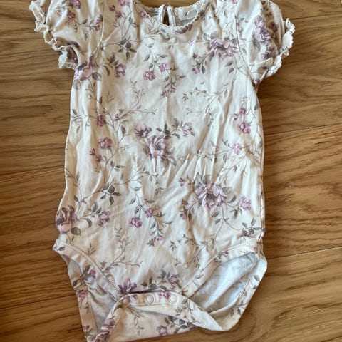 Kerran käytetty Newbie-body koossa 86. Luonnonvaalealla pohjalla viininpunaisia ruusuja lehtineen. Hihoissa rypytykset. Koiratalous. Hajusteettomasti pesty.