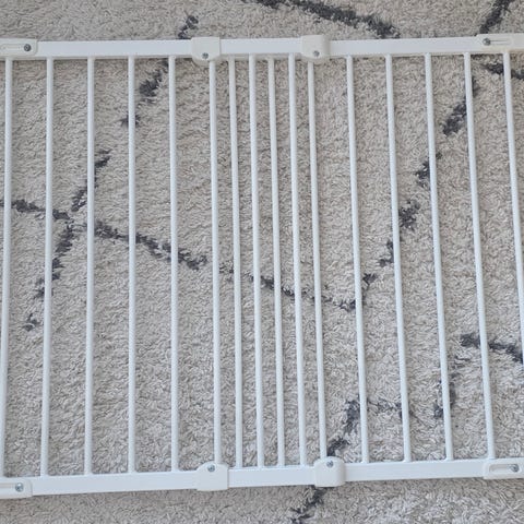 Valkoinen metallinen turvaportti oviaukkoon tai portaikkoon.
