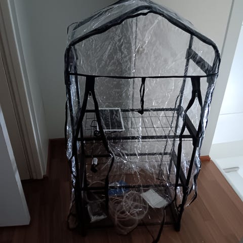 Ehjä, muovinen. Koko muistelen 140x140 on nyt paketissa. Muovit ja putket ehjät. Naru millä ovi nostetaan ylös, on poikki, näkyy kuvassa. Helmoissa likaa, en ole paremmin yrittänyt putsata, pyyhkinyt vaan. Maata vasten niin likaantuu