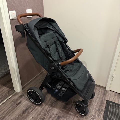 Rattaat saa makuuasentoon. Säädettävä työntöaisa. Kääntyvät/lukittavat eturenkaat.